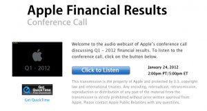 Apple’s Conference Call with the media yesterday is now available online.  The Phone Conference to announce the quarterly profits was held at 5pm EST 24 January and announced Apple’s record breaking quarter.  To listen to the entire audio of the event, go to the quicktime page at: