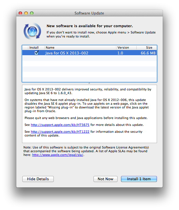“Java for OS X 2013-002 delivers improved security, reliability, and compatibility by updating Java SE 6 to 1.6.0_43.