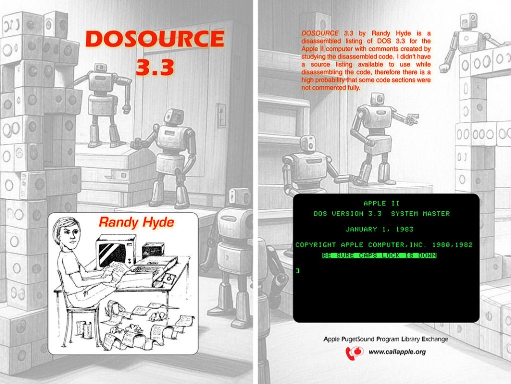 DOSource 3.3 by Randy Hyde is a disassembled listing of DOS 3.3 for the Apple II computer with comments created by studying the disassembled code. While the code was first released in 1981 on disk by Lazer Micro Systems, and later by A.P.P.L.E. in 2002 on CD, this is the first time Randy’s commented disassembled listing is available as a 140+ page printed book. The contents are summarized in a Table of Contents PDF.