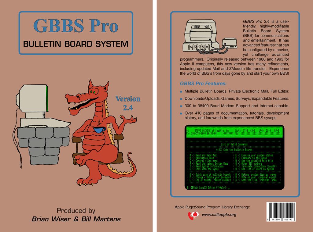 GBBS Pro Bulletin Board System: Version 2.4 is available through the A.P.P.L.E. bookstore with production and fulfillment by Lulu. Read the Table of Contents (includes list of 2.2 to 2.4 changes). Some proceeds benefit a variety of charities. The new GBBS Pro 2.4 software and other resources are available from our official GBBS Pro site: gbbs.applearchives.com and Github repository.
