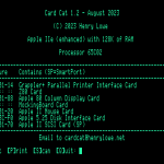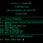 Henry Lowe has announced the latest version of his Card Cat application. Card Cat identifies cards in the slots of Apple II series machines and can accurately identify over 100 different Apple II series specific cards. The latest version of Card Cat includes the following changes and updates: Card Cat version 1.92 is a free download and is available in both DSK and PO format disk image from the Card Cat webpage at: https://henrylowe.net/card-cat/