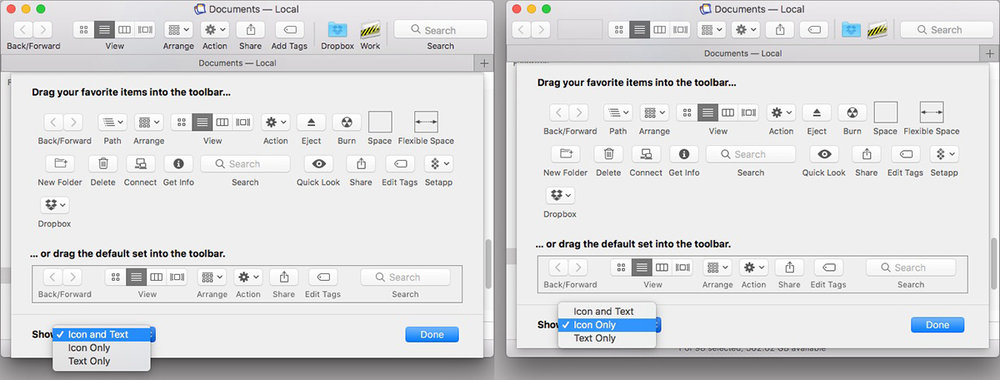 Here’s one final Toolbar tip before we move on: If you often forget what your Toolbar icons mean, choose Icon and Text from the pop-up Show menu in the lower left corner of the Customize Toolbar overlay. This will display the item’s name below its icon, as shown on the left below: