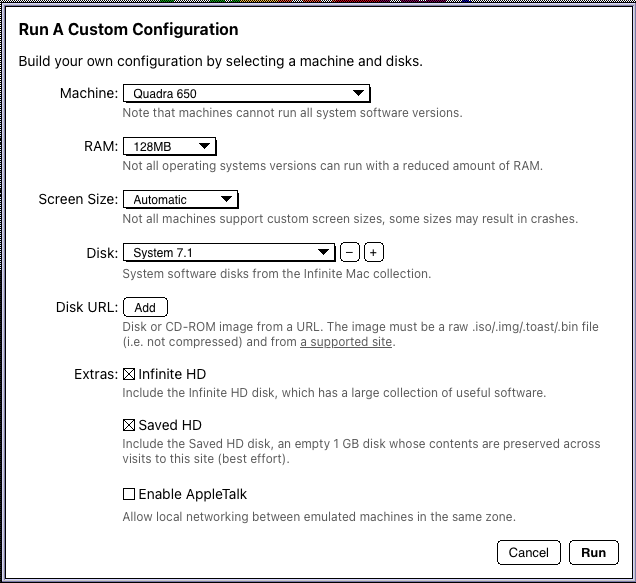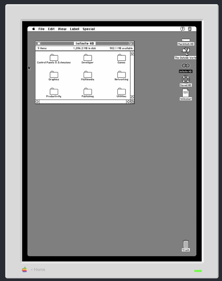 Infinite Mac has the ability to run any of the vintage OSes all the way from Mac OS 1.0 to Mac OS 9.0.4 as well as the options to run in environments that were rarely found in the real world of the actual machines. This includes the custom screen sizes as well as RAM up to 256mb on the Power Macintosh G3 Quadra. Older systems are memory realistic such as the 128K on the Mac 128.