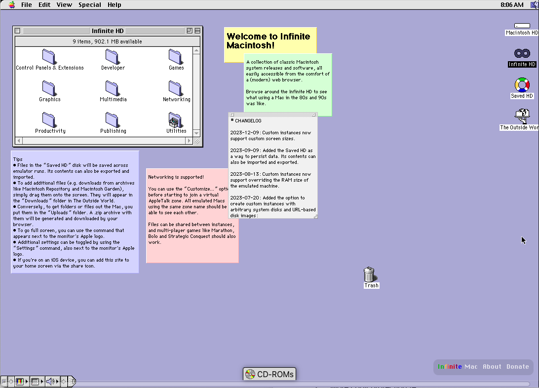 Infinite Mac has the ability to run any of the vintage OSes all the way from Mac OS 1.0 to Mac OS 9.0.4 as well as the options to run in environments that were rarely found in the real world of the actual machines. This includes the custom screen sizes as well as RAM up to 256mb on the Power Macintosh G3 Quadra. Older systems are memory realistic such as the 128K on the Mac 128.