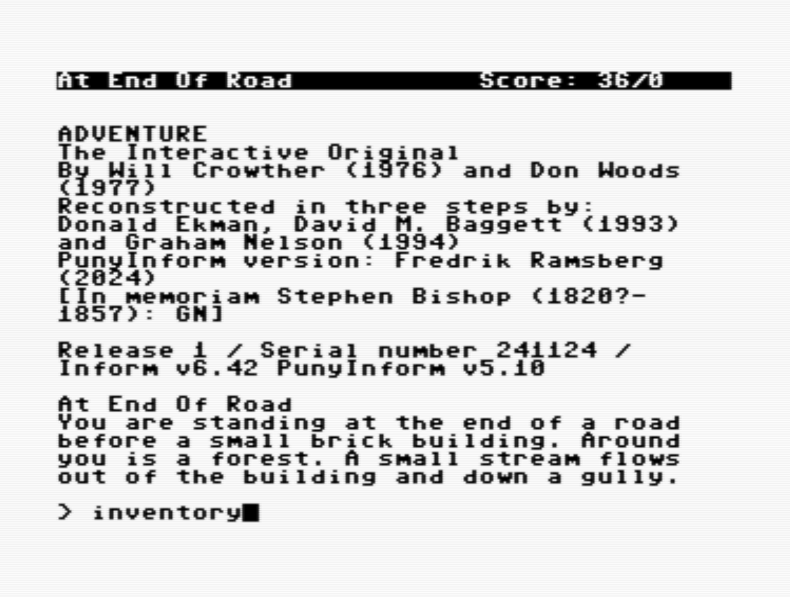 This particular version of the game came out on 24 November 2024, and is built on the PunyInform library. It was adapted from the Inform 6 version, by Graham Nelson et al. The game is very close to the original game in gameplay. Type HELP in the game to read some background story.