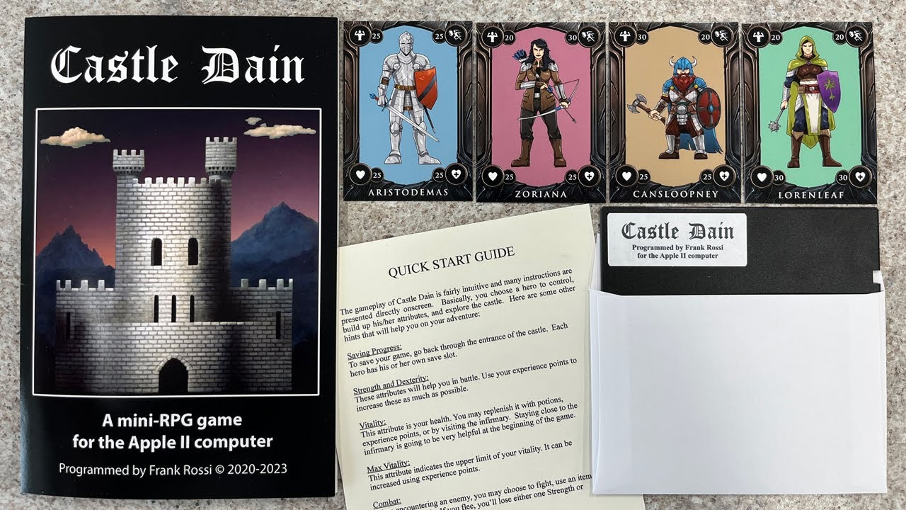 The author of the Apple II game Castle Dain is offering a physical release of his mini-RPG game for the Apple II. This limited release includes a 6″ x 9″ folder, 5.25 disk, quick-start guide, cross-section diagram of the castle, and 4 collectible cards. The cost is $25 plus shipping. For more information and an in-depth video about this release, click on the video below: