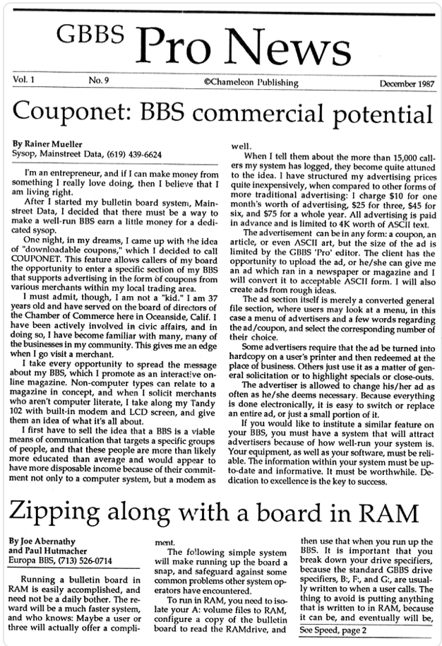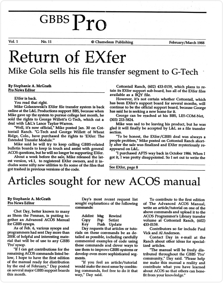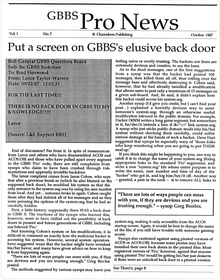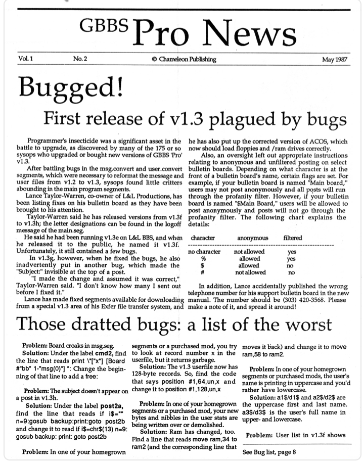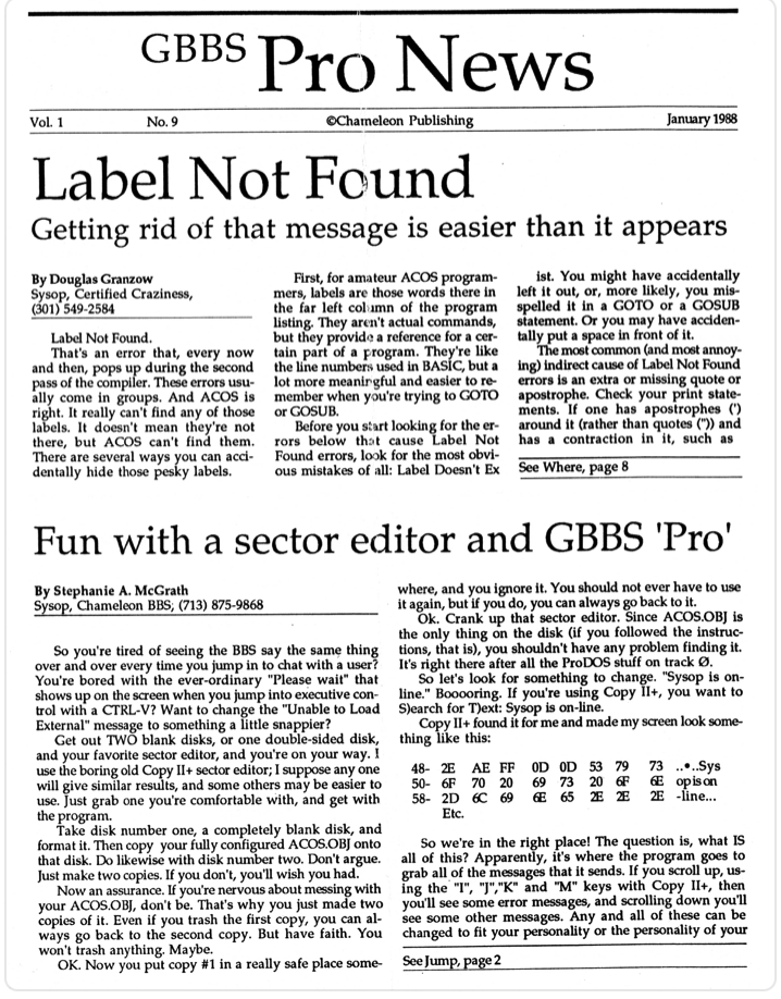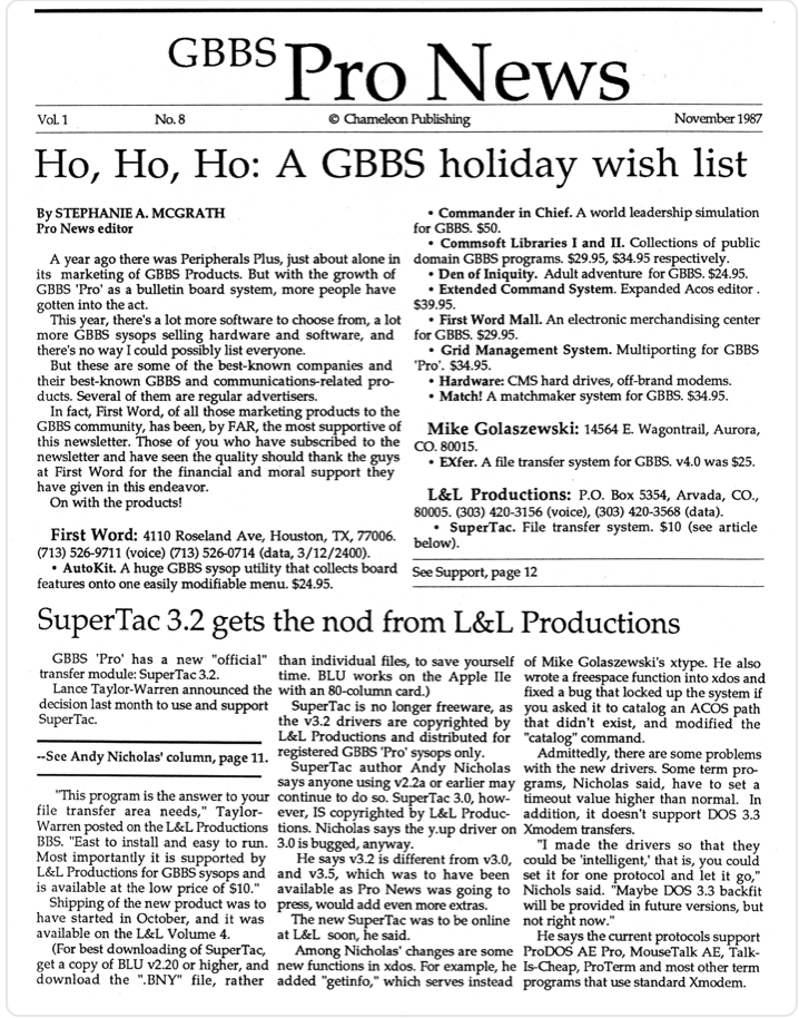 There were 11 known issues of the GBBSPro Newsletter published by L&L Productions in April 1987 to May 1988. Of those, 9 of them are in hand and linked below. Missing issues include Issue No. 3 and No. 5. If anyone in the community has any of these newsletters, please let us know asap so that they can be included in the archive.