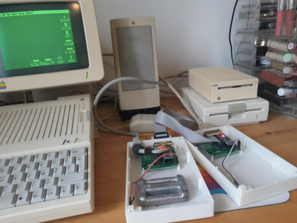 Colin Leroy-Mira isn’t new to the Apple II scene. He’s the developer behind Shufflepuck Café, the air-hockey classic game that still gets played on emulators and original hardware by a number of folks in the community. But like many Apple II enthusiasts, he hit a wall with storage. “I wanted some storage space on the Apple //c to be able to save more of my Quicktake pictures, and easily organize my documents,” he explains on his project site. “I also wanted to be able to still boot from the internal floppy disk drive, and have access to the external floppy disk drives.”