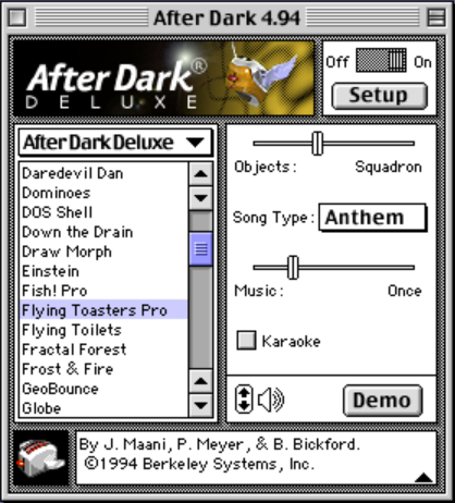 For those of you who are fans of the flying toasters of yesteryear, there is now reason to celebrate! Matthew Pierce (CybernetixZero) has modified the AfterDark program and the modules to run smoothly on MacOS 9.2.2.