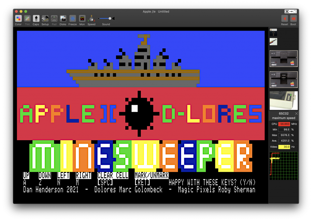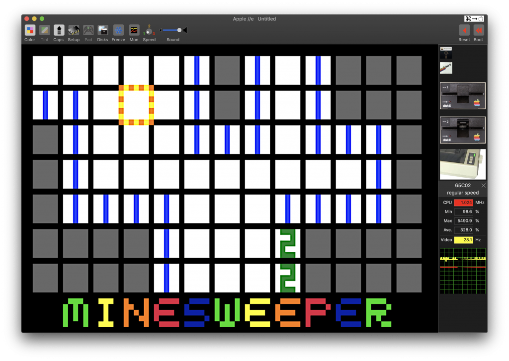 We are happy to present a Minesweeper port in Double LORES for the Apple //e and IIgs. The perfect port was done by Daniel Henderson using the Magic Pixels library by Roby Sherman and runs on real wood as also in most emulators.