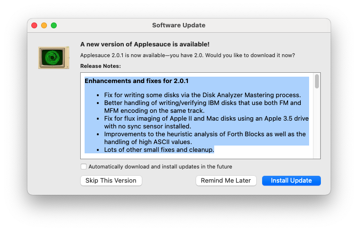 The Applesauce Floppy Disk Controller client software has been updated. This update is primarily a patch update with several fixes to the software including the following: