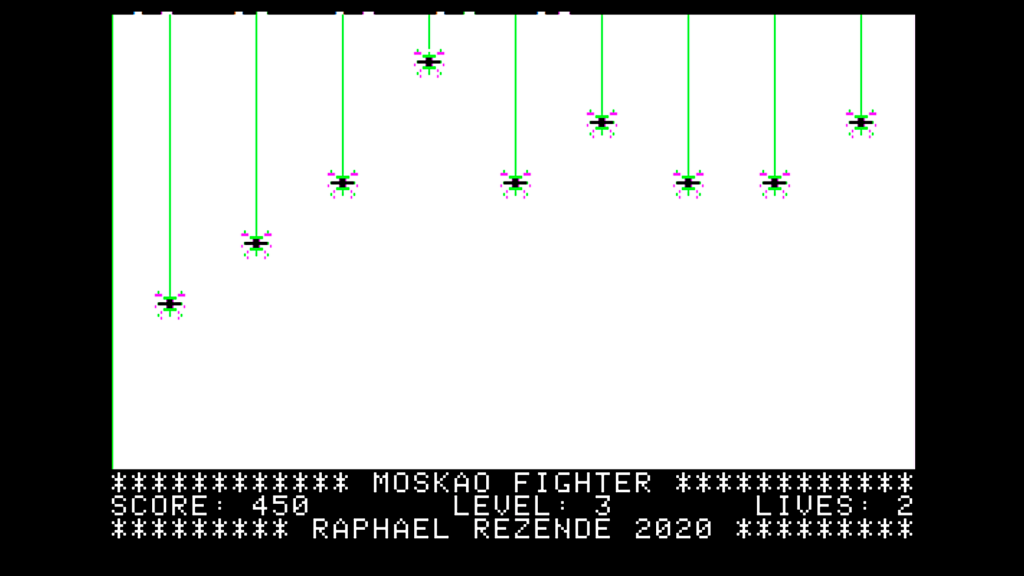 Game play is through the Apple II keyboard. You use the arrows keys to move the Moskão and the space bar to shoot. The game has 3 levels of difficulty, and each level increases the speed with which the spiders go down through the webs. The game also records up to 10 scores on the disk.
