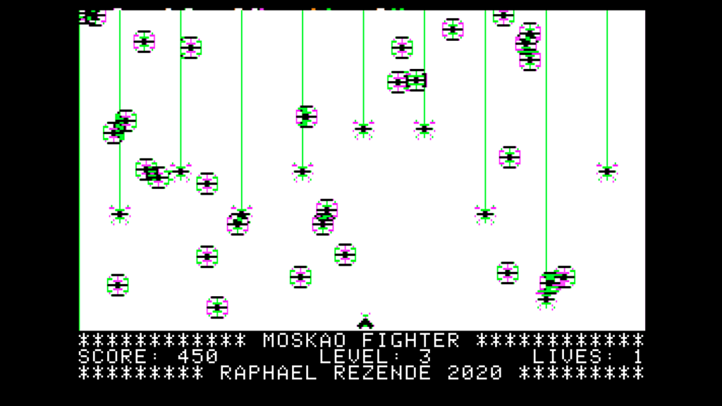 Raphael Rezende has created a new Apple II game as part of the Apple II Software Enthusiasts content sponsored by Roby Williams. Moskão Fighter is an action batle game in the tradition of the Centepede type arcade game arena in which you are Moskão, a warrior who tries to prevent an army of spiders from attacking his people.