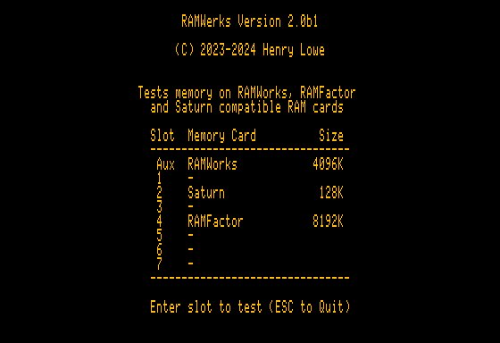 RAMWerks 2 is now available for testing. In addition to testing RAMWorks-compatible Apple II memory cards, this new version also tests RAMFactor, Apple Memory Expansion (‘Slinky’) and Saturn compatible RAM cards (with some limitations – see web page). RAMWerks now runs on all Apple II computers and supports 40 or 80 column displays. You can download a disk image of RAMWerks 2 from: https://henrylowe.net/ramwerks/
